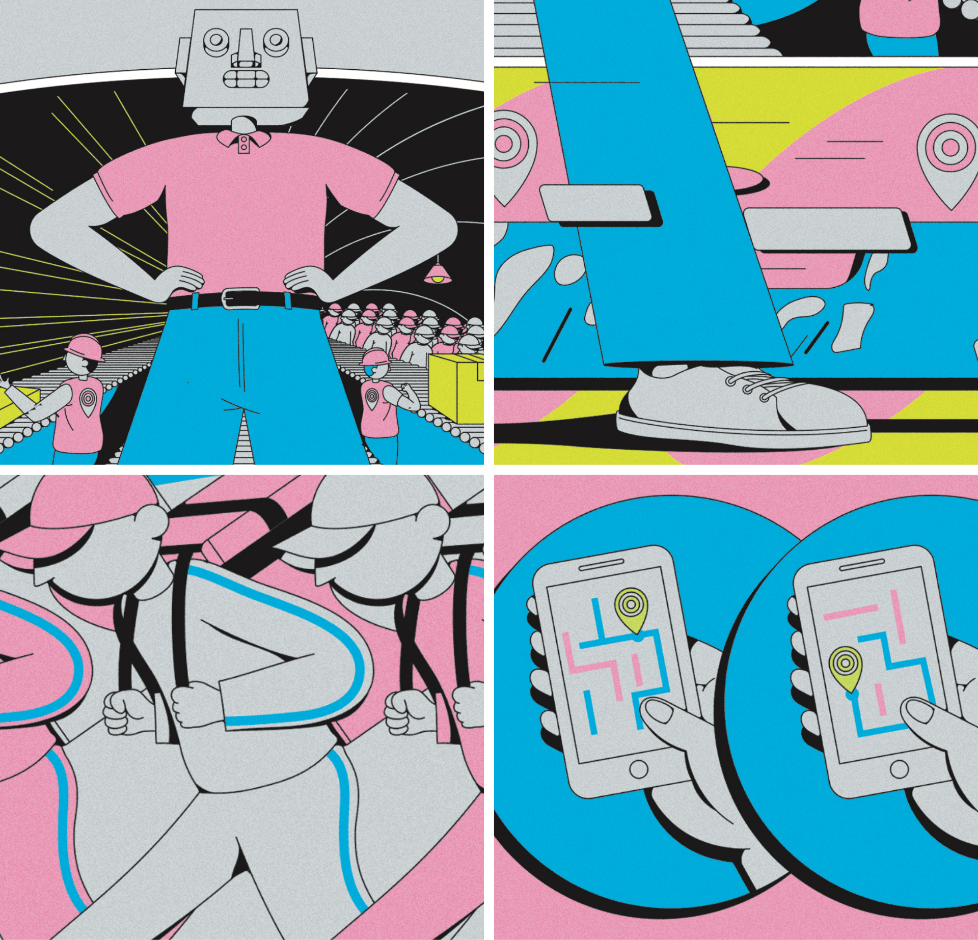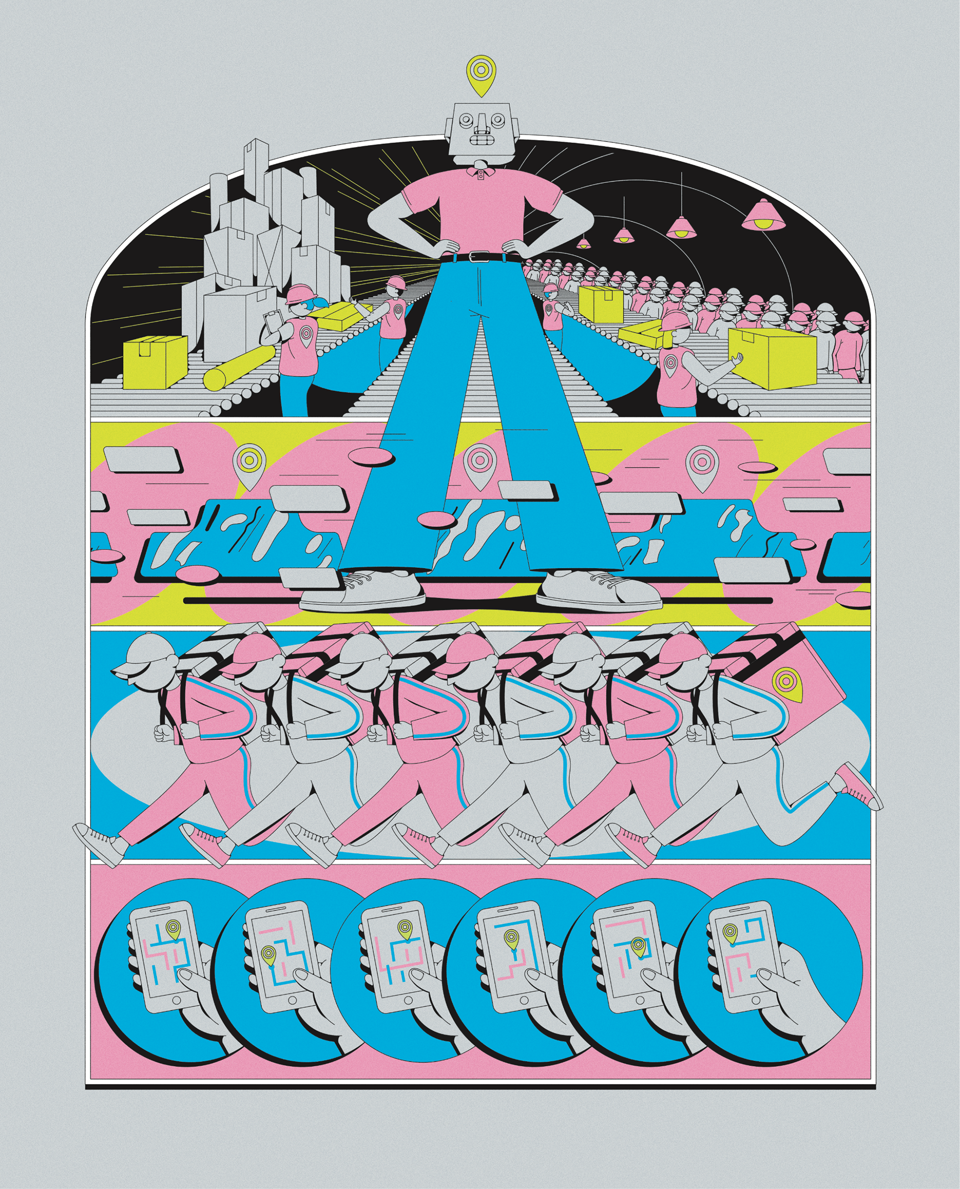 Esta ilustraación acompaña a un artículo sobre como la gig economy está cambiando las condiciones de los trabajadores y aumentando su precariedad.