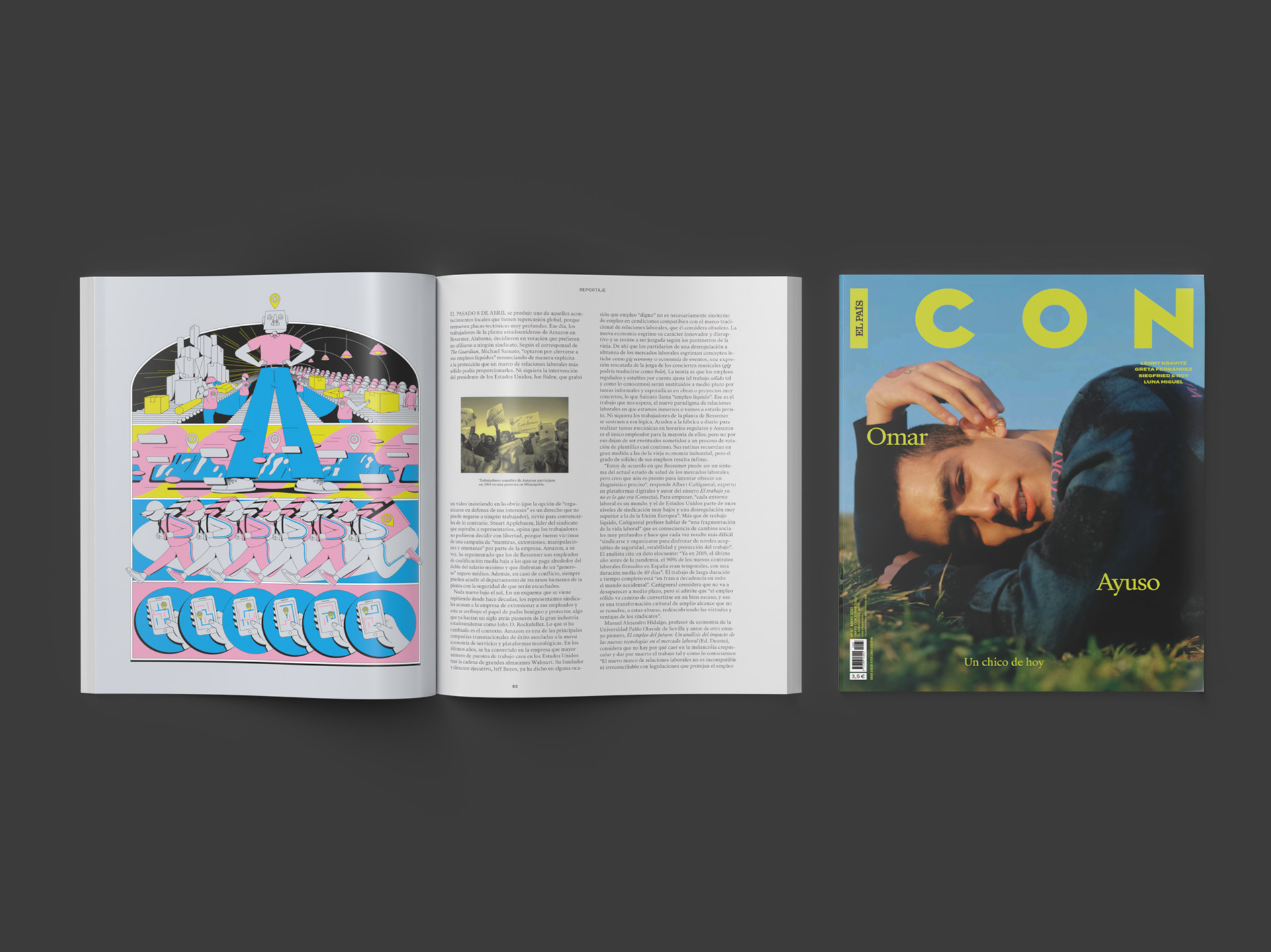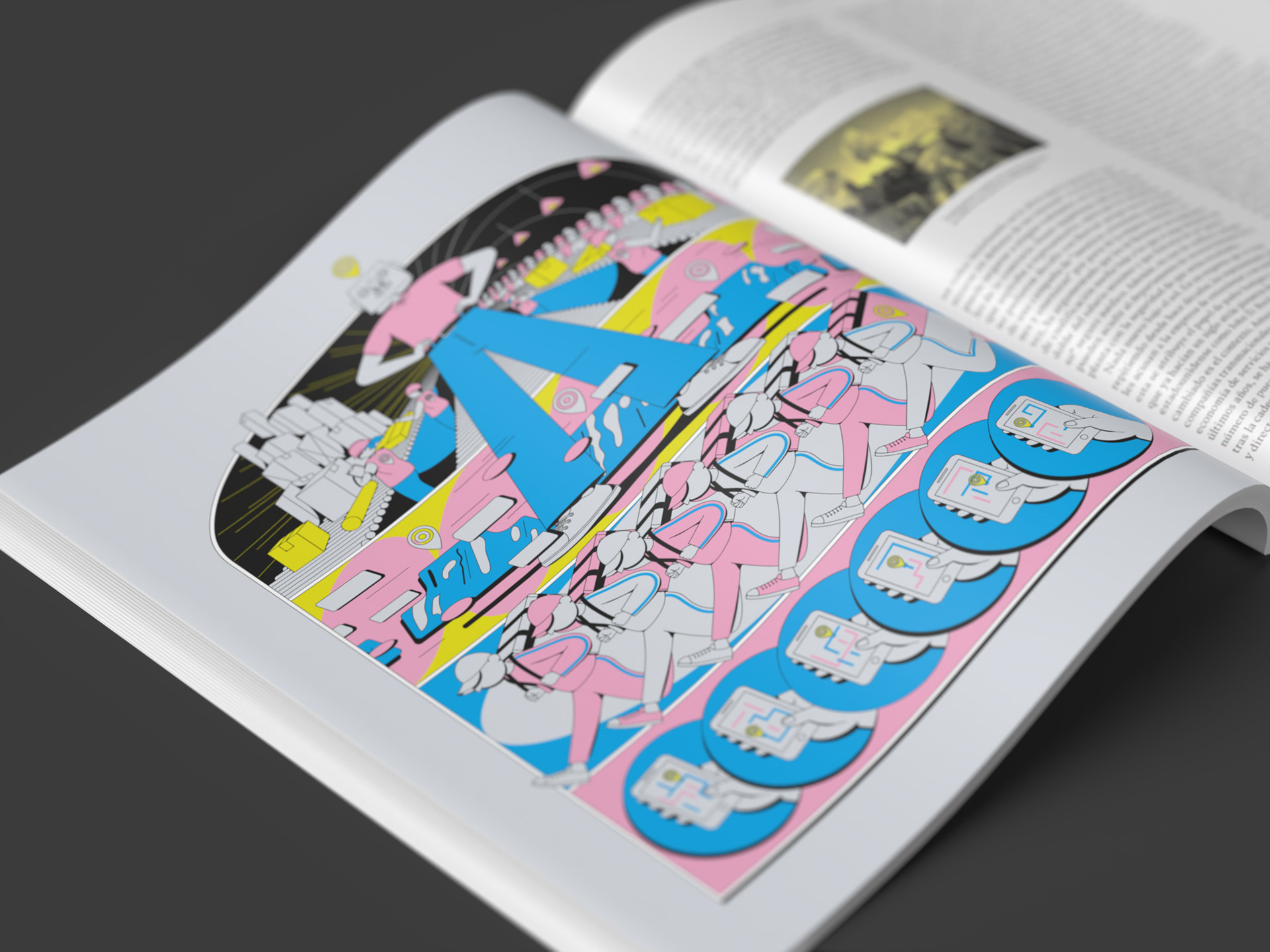 I wanted to depict this new gig economy as a distopian-pop tyranny mixing futuristic cartoons like Futurama and The Jetsons, with the political and social themes of Fritz Lang's 1927 Metropolis and Mexican muralists Siqueiros, Orozco and Rivera. For the main character I got inspired by Kazumasa Yamashita's Face house in Kyoto.